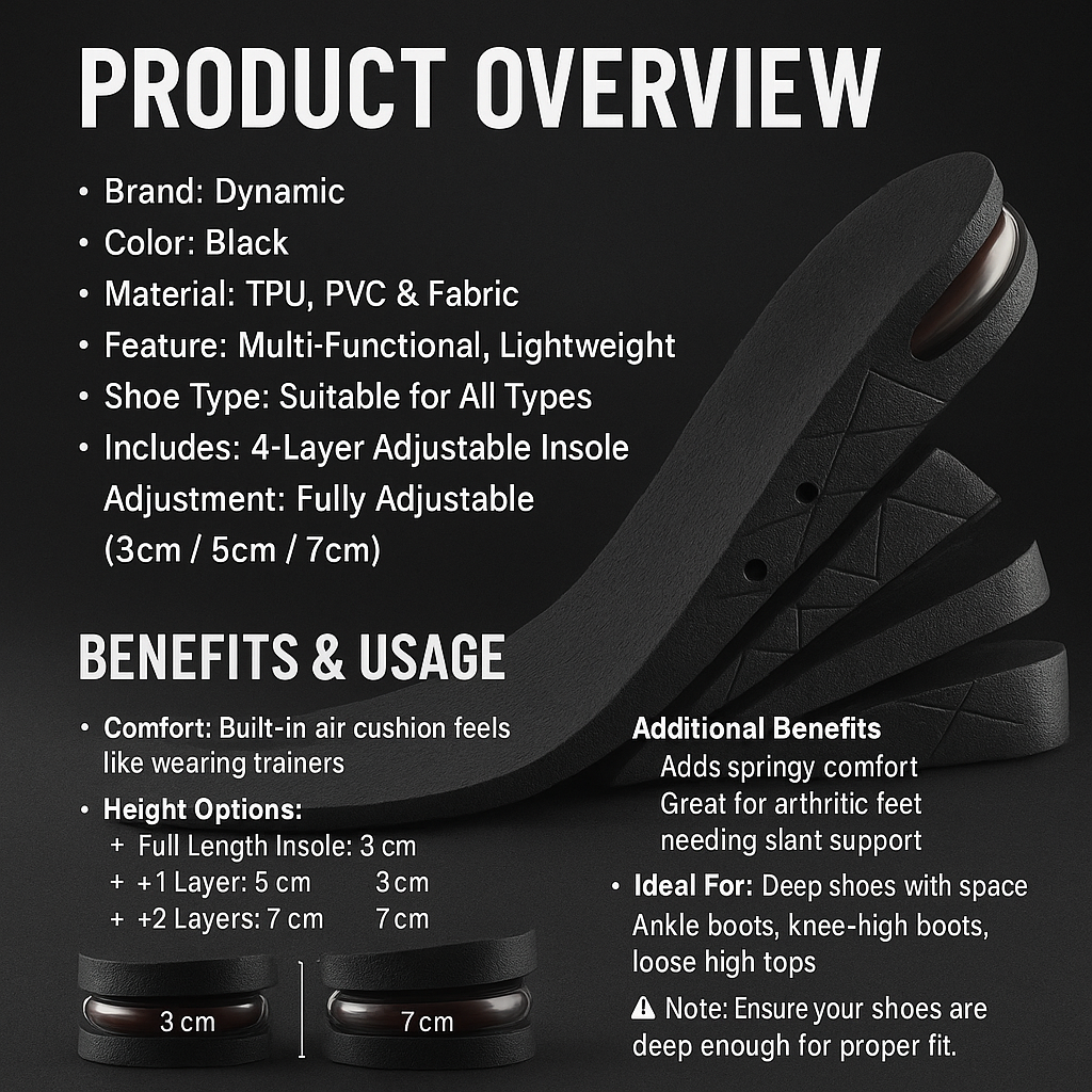 - These height increasing insoles are come as three layers -- the main full length insole ( height 3cm) and two additional heels (each height 2cm). It can be set to 4 different heights ( from 3cm to 5cm to 7cm).